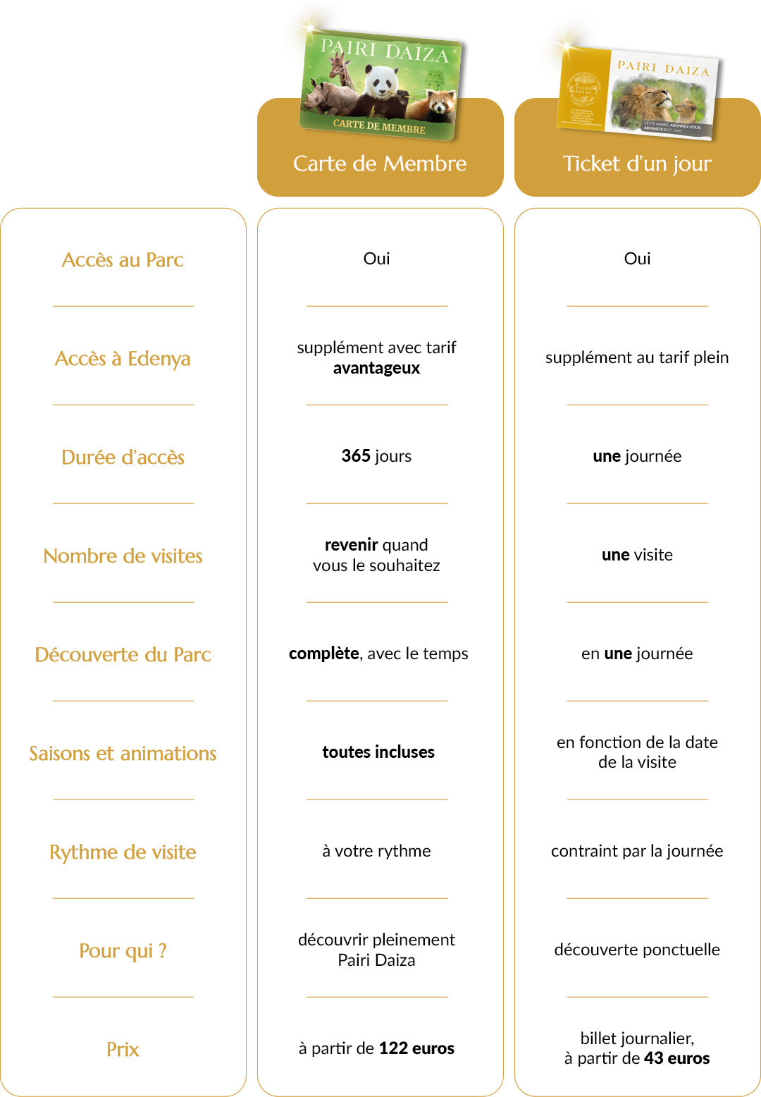 Le ticket d’un jour et la Carte de Membre répondent à deux façons de vivre le Pairi Daiza: l’une, le plaisir d’une visite ponctuelle, comme une parenthèse d’évasion ; l’autre, l’envie de revenir au fil du temps, de retrouver les lieux et d’en suivre les saisons. Ici, nous vous aidons à choisir la formule qui s’accorde le mieux à votre rythme de visite.